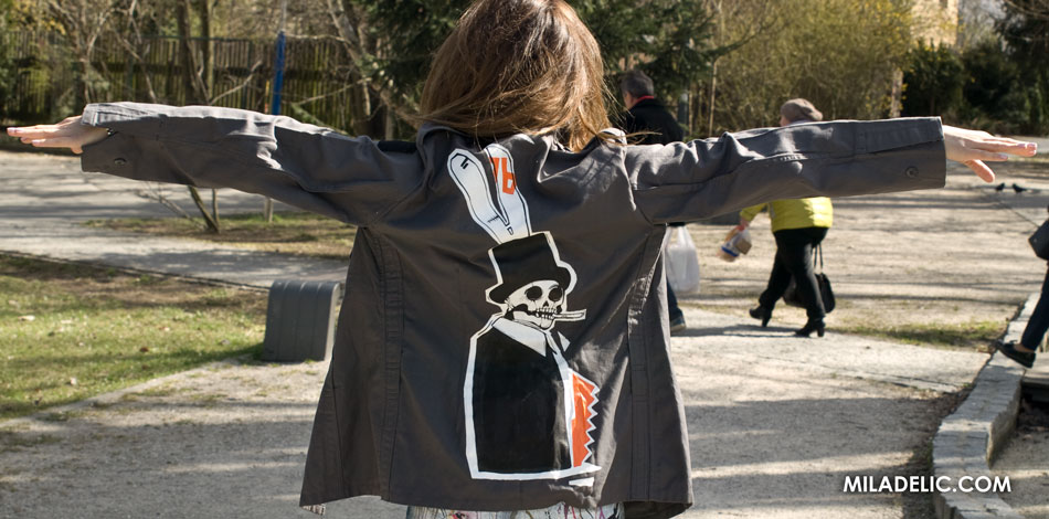 Tym razem ręcznie malowana kurtka z motywem z mojego obrazu z serii Utopia. Seria obrazów powstała po obejrzeniu serialu Utopia, który mocno wdarł się w moją psychikę i zainspirował do tworzenia obrazów i grafik. Malowałam jak szalona, powstały całe zeszyty grafik i 16 obrazów. Namalowała też co najmniej 50 koszulek zainspirowanych tym jakże wspaniałym serialem.